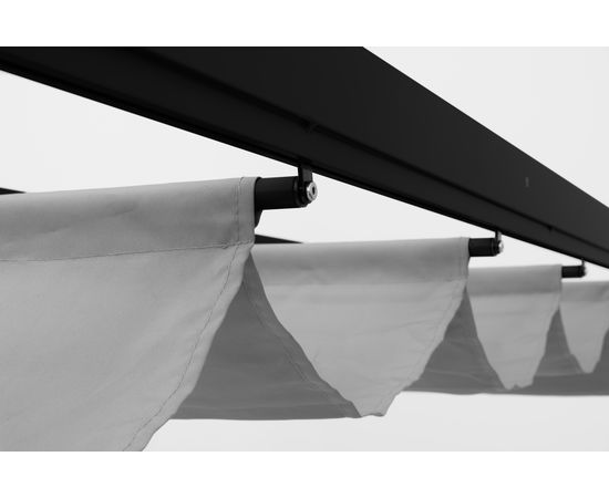 3 x 3 x 2,3 m. Alumīnija kājas 100 x 100 mm. Alumīnija rāmis 30 x 60 mm. Jumta kopnes no tērauda 20 x 30 mm. Poliestera pārvalks 180g ar savilkšanas aukliņām. Lineārā un elegantā lapene papildina pagalma un dārza komfortu un nodrošina vēsu atpūtas vietu vasaras karstumā.