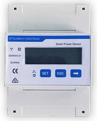 | PV smart meter 250A, 3-phase, with RS485, Modbus, 3P4W Features: The smart meter is designed for grid export limitation and self-consumption monitoring. Compatible with Huawei PV inverters. Class1 measurement reliability. With LCD display. Smart Meter is easy to mount on DIN rail 3.5mm. Specifications: Nominal voltage: AC 230V~400V. Power grid type: 3P4W. L-L voltage range: AC 304V ~ 499V. L-N voltage range: AC 176V ~ 288V. Current: 250A/ 50mA. Frequency: 50/60Hz. Number of phases: 3. Accuracy class: class 1 (voltage +/-0.5%, current /power +/-1%, frequency +/-0.01Hz). Interface: RS485. Baud rate 9600 bit/s. Communication protocol: Modbus RTU. Installation: on DIN rail 35mm. Dimensions: 102x72x65.5 mm. Operating temperature: -25°C to 60°C. Operating humidity: 5-95% non-condensing. Weight: 840g. Colour: white. Certifications: EN 61326-1:2013; IEC 61326-1:2012; EN 61326-2-1:2013; IEC 61326-2-1:2012; EN 61010-1:2010; IEC 61010-1:2010; EN 61010-2-1:2010; IEC 61010-2-1:2010. Consumption: 1W. RS485 cable length: 10m. Warranty: 24 months. ![]() Download Specification DTSU666-H.pdf  |