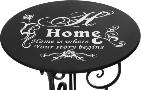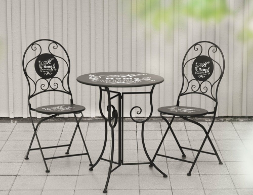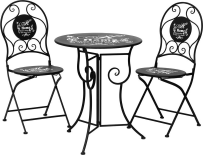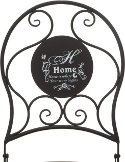 Skaisti veidotās balkona mēbeles ar tērauda karkasu ir lieliski piemērotas balkonam un segtai terasei. Komplektā ietilpst apaļš galds un divi eleganti krēsli. Dekoratīvs teksts uz galda un krēsliem: Mājas ir vieta, kur sākas jūsu stāsts. Galda diametrs 60 cm, augstums 73 cm. Krēsla maksimālā kravnesība ir 110 kg.