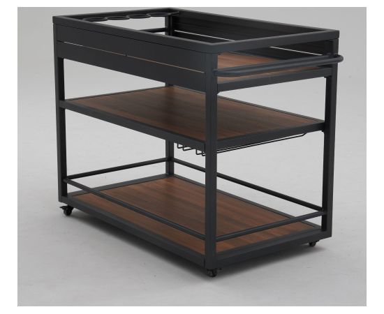 The frame and shelves of the kitchen module are made of aluminum. The frame is finished with dark gray powder paint. The shelves are painted in a brown color reminiscent of natural wood texture.