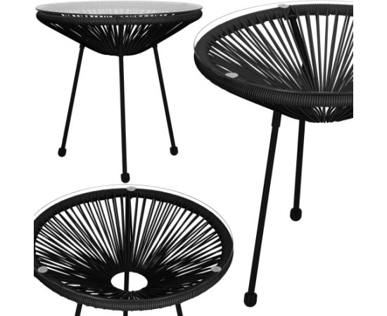 | PAMATINFORMĀCIJA Zīmols: Springos® Melna krāsa Materiāls: PE rotangpalma, metāls, rūdīts stikls Kāju skaits: 3 Produkts pašmontāžai - instrukcija iekļauta Izmēri: Kopējais augstums: 49 cm Galda virsmas diametrs: 50 cm Stikla biezums: 0,5 cm Galda virsma ir uzstādīta uz trim piesūcekņiem ar diametru 2,5 cm Kāju garums: 40 cm Kājas biezums: 12,5 mm Pēda: garums 2,7 cm; biezums 24,5 mm Galda virsmas malas biezums: apm. 2,5 cm Konstrukcijas cauruļu biezums zem darba virsmas: 12,5 mm Rotangpalmas virves biezums: 4 mm Papildus informācija: Pretslīdes elementi uz kājām |