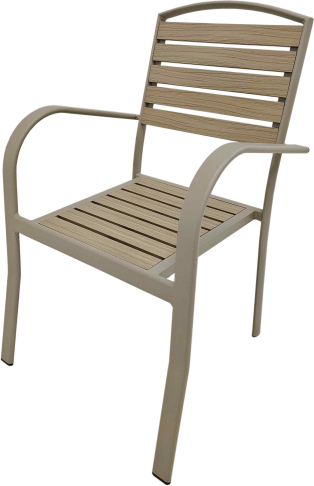 Atpūtas krēsls ar roku balstiem, metāla rāmi un plastmasas dēļu sēdvietu.