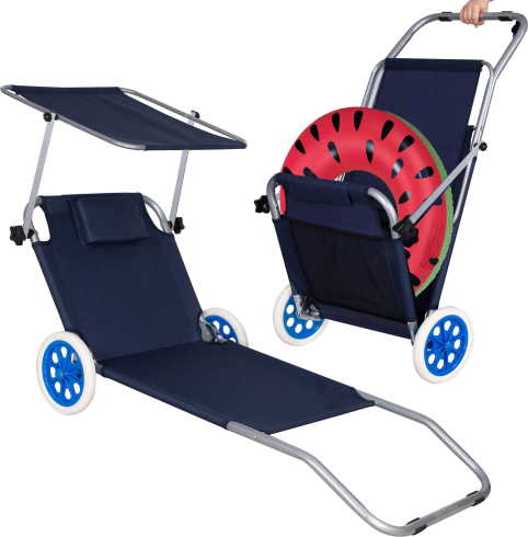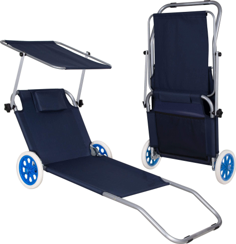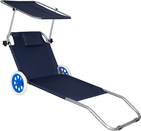 Dārza sauļošanās gulta Springos GC0044, salokāma, ar riteņiem un jumtiņu, tumši zila