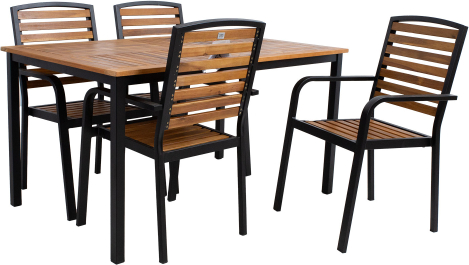 Dārza mēbeļu komplekts DALYA galds un 4 krēsli. Galda un krēsla kājas un rāmji ir izgatavoti no tērauda un apdarināti ar brūnu pulverkrāsu. Galda virsma un krēslu sēdekļi un atzveltnes ir izgatavotas no akācijas koka un apstrādātas ar koka kazas eļļu. Krēsli ir saliekami. Galda izmēri ir 140x90xH75cm. Krēsla izmēri ir 56x60,5xH93,5cm. Svara ierobežojums 100 kg. APKOPE: koks ir dzīvs dabīgs materiāls, kura izskats mainās atkarībā no laikapstākļiem. Regulāri tīriet mēbeles, pasargājiet tās no liekā mitruma un UV starojuma. Ar vieglu slīpēšanu un jaunu eļļas kārtu vismaz reizi gadā pietiek, lai mēbeles atsvaidzinātu un piešķirtu tām jaunu izskatu. UZGLABĀŠANA: Vasaras sezonas beigās iesakām dārza mēbeles uzglabāt telpās. Pirms glabāšanas notīriet un nosusiniet mēbeles. Glabāšanai izmantojiet sausu un labi vēdināmu telpu. Uzglabāšanas laikā sargājiet mēbeles no tiešiem saules stariem.