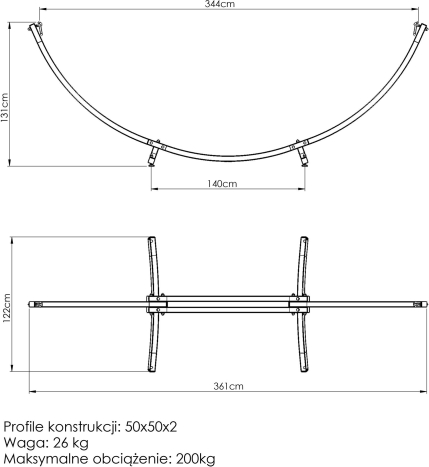 Tehniskie dati Garums 361 cm Platums 122 cm Augstums 131 cm Maksimālā slodze 200 kg Svars 26 kg Būvniecības profils 50x50x2 mm |