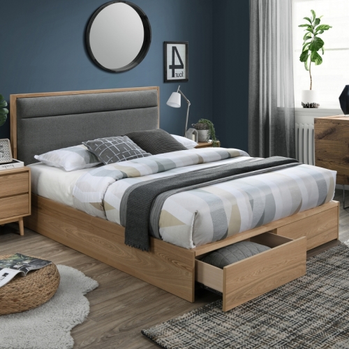 Matracis nav iekļauts komplektā. Gultas vispārējie izmēri 165,5x208xH105cm. Piemērots matracis 160x200cm. Gultas rāmis: MDF pārklāts ar dabīgā oša finiera ozola krāsas lakotu apdari. Galvas dēļa polsterētā daļa ir pārklāta ar tumši pelēku poliestera audumu. 2 atvilktnes pamatnes rāmja pēdas pusē. Gultas pamatnes līstes iekļautas komplektā. | ||||||||