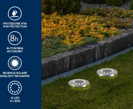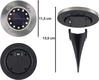 2 saules celiņu gabarītlampu komplekts piebraucamiem ceļiem un dārziem, ar mietiņiem. Lampas automātiski ieslēdzas tumsā un izslēdzas dienasgaismā, pateicoties saules gaismas enerģijai. Mietiņi ļauj piestiprināt lampas pie zemes jebkurā vietā dārzā, blakus puķu dobēm vai celiņiem. Korpuss izgatavots no plastmasas, saules panelis izgatavots no stikla.