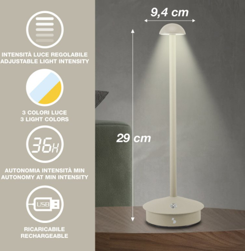 | Izgaismojiet savu telpu ar stilu un praktiskumu ar Beper uzlādējamo galda lampu. Ar skārienjutīgu ieslēgšanu un modernu dizainu tā ir ideāli piemērota jūsu rakstāmgaldam, naktsskapītim vai paņemšanai, kur vien vēlaties. Vienkāršs pieskāriens ļauj izvēlēties starp siltu, aukstu vai dabisko apgaismojumu, savukārt, turot nospiestu pogu, viegli pielāgo gaismas intensitāti atbilstoši videi un diennakts laikam. Pateicoties integrētajam lieljaudas akumulatoram, tā piedāvā pagarinātu akumulatora darbības laiku (līdz 48 stundām ar minimālu intensitāti). Uzlādējama, izmantojot komplektā iekļauto USB kabeli, tā ir ideāls risinājums tiem, kas meklē funkcionalitāti, kustību brīvību un personalizētu atmosfēru.
