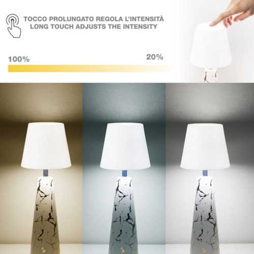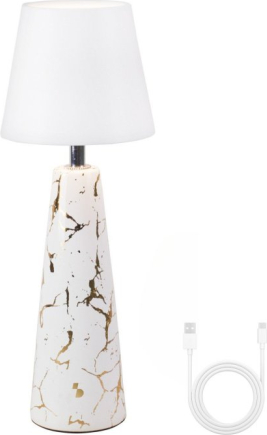 Ar savu balto marmora efekta keramikas kātu un zelta detaļām MARBLE Beper uzlādējamā galda lampa ir vairāk nekā tikai gaismas avots: tā ir eleganta un mūsdienīga mēbele, kas lieliski piemērota jebkuras telpas dekorēšanai. Pateicoties skārienjutīgajai sistēmai, pietiek ar vienkāršu pieskārienu, lai izvēlētos starp siltu, aukstu vai dabisku apgaismojumu un regulētu gaismas intensitāti, turot nospiestu skārienpogu. Izstrādāta, lai piedāvātu daudzpusību un brīvību, tā ir aprīkota ar ilgstošas darbības akumulatoru, kas nodrošina līdz pat 48 stundām autonomijas ar minimālu intensitāti. Komplektā iekļautais USB kabelis nodrošina ātru un vienkāršu uzlādi. Ideāli piemērota naktsgaldiņiem, rakstāmgaldiem, viesistabām vai kā atmosfēras lampa katrā mājas stūrī.