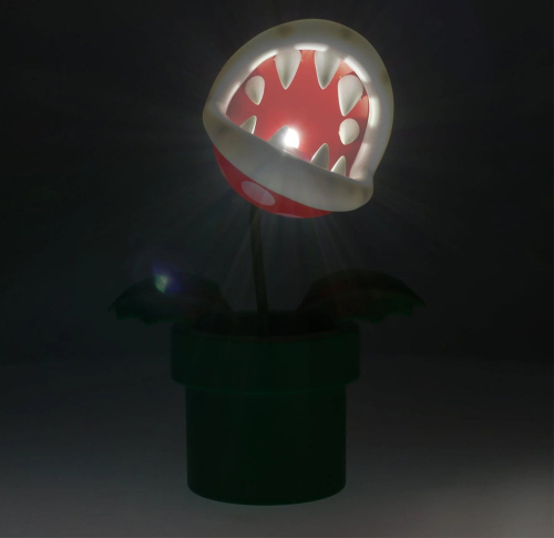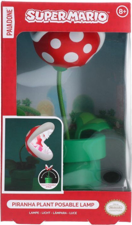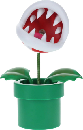 Izgaismojiet savu istabu ar šo kustīgo Piranjas auga lampu. 21 cm augstā galda lampa ir veidota kā mežonīgais Piranjas augs no Super Mario™ spēlēm. Ar pilnībā kustīgu kātiņu jūs varat noliekt auga gaismu izstarojošo muti tur, kur jums tā visvairāk nepieciešama. Darbiniet gaismu ar 3 AAA baterijām (nav iekļautas komplektā). Kustīgā Piranjas auga lampa būs lielisks papildinājums jebkura spēlētāja mājām. Pilnībā kustīgs kātiņš 21 cm augsta lampa Darbojas ar 3 AAA baterijām (nav iekļautas komplektā) Oficiāli licencēts Nintendo® produkts