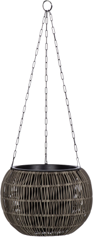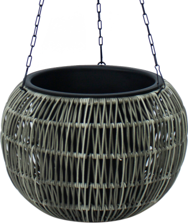 | Piekarināms puķu pods WICKER D32 x H22 cm, pelēka. Puķu poda metāla rāmis ir pārklāts ar plastmasas pinumu. Plastmasas iekšējā poda izmēri: D21 x H20 cm. Iekšējais pods ir bez cauruma. Melnas metāla piekarināmās ķēdītes 57 cm. |