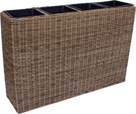 | Flower box WICKER 89x24xH60cm, light brown. The metal frame of the flower box is covered with plastic wicker. The dimensions of the plastic inner pot are 17,5x17,5xH16cm. The inner pot is without a hole. The set includes four inner pots. | ||||||||