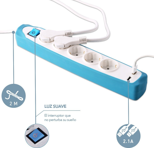 5 Schuko kontaktligzdas un 2 usb porti silikona vāks-2 m garš kabelis-plakans spraudnis. |