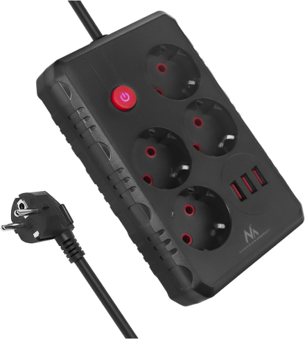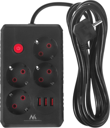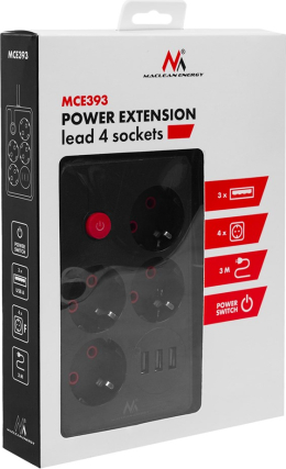 Maclean power strip, 4-socket extension cable + 3xUSB, 110-240V AC 50/60Hz, 2.1A max 2500W, 3m, black, MCE393 B