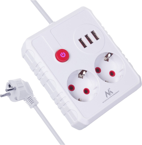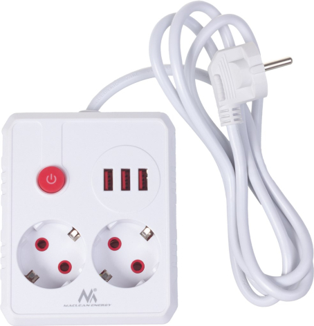 Maclean power strip, extension cord 2 sockets + 3xUSB, 110-240V AC 50/60Hz, 2.1A max 2500W, 1.5m, white, MCE387 W