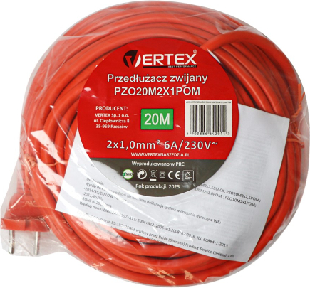 Przedłużacz zwijany 20m, PZO20M2x1,0mm VERTEX