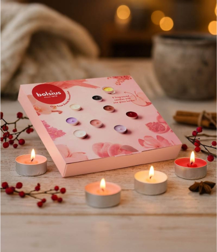 Bolsius Dāvanu komplekts kastītē tējas sveces mix aromāti + stikla svečturi