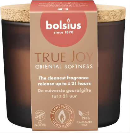 Bolsius Svece arom. stikla gl. ar korķi True Joy Ø66x83mm oriental softness