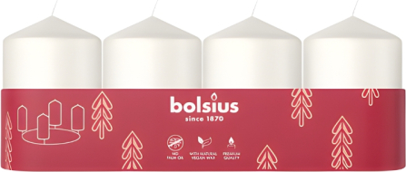 4 sveču komplekts, kas ir lieliski piemērots Adventam, Ziemassvētku vainagiem vai vienkārši kā vienkārša dekorācija. Katra Bolsius svece deg ar spilgtu liesmu un deg uz iekšpusi. Bolsius svecēm ir pievienots vegānisks augu vasks.