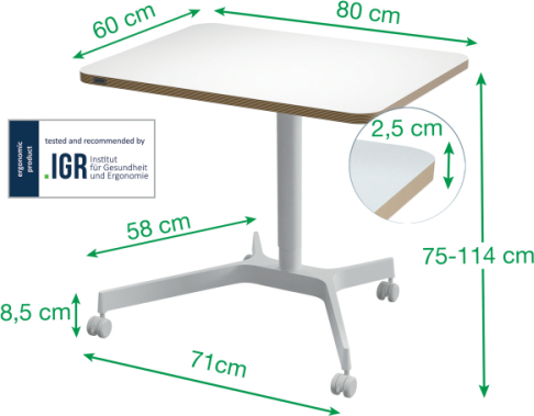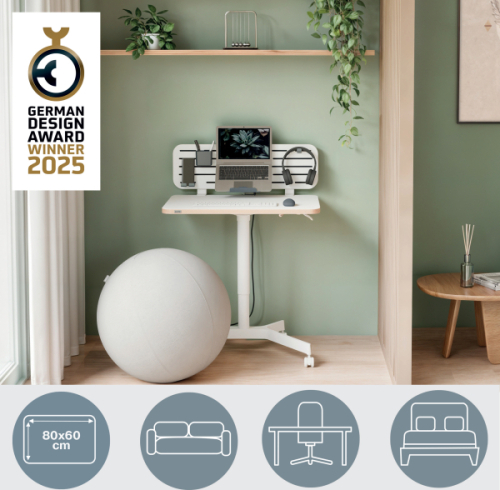• Kompakts un stilīgs mobilais galds darbam sēdus un stāvus, kas piemērots telpām ar ierobežotu vietu • Viegla pāreja no sēdēšanas uz stāvēšanu, lai izvairītos no sāpēm un diskomforta un veicinātu muskuļu kustību, kas pozitīvi ietekmē labsajūtu • Viegli veicama pneimatiskā augstuma regulēšana no 75 līdz 114 cm, pielāgota dažādiem izmēriem un vajadzībām • 80 x 60 x 2,5 cm darbvirsma ar maksimālo slodzi 20 kg ļauj novietot uz tās klēpjdatoru ar statīvu, tastatūru, peli un plaukstu balstu • Galds ir paredzēts elastīgai lietošanai un kā pagaidu darba vieta, lieliski piemērots mājas birojam, koplietošanas darba telpām vai sanāksmju telpām • Apvienojams ar viedajiem Leitz Ergo perforētajiem galda organizatoriem 6548 vai 6549, lai atbrīvotu vērtīgu darbvirsmas vietu (iespējams iegādāties atsevišķi) • 4 fiksējoši 360° riteņi, kas piemēroti lietošanai uz visa veida grīdām (flīzes, lamināts, koks, paklājs) Sertificējis FSC, kā arī sertificējis TÜV un GS saskaņā ar PPP 51962A standartu • 2+1 gada garantija - reģistrējieties, lai iegūtu papildu gadu • Viegli saliekams saskaņā ar pievienotajām instrukcijām • Izveidojiet sev individuālu un ērtu darba vidi, lai ar Leitz Ergo JUSTOS LABI | ||||