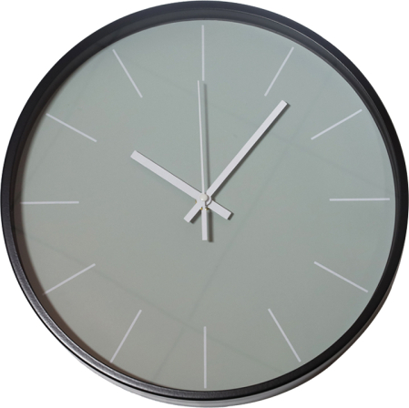 Sienas pulkstenis ar metāla rāmi. Darbojas ar 1 x AA bateriju (nav iekļauta komplektā). Diametrs 30 cm.