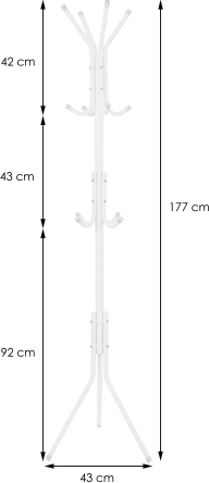 Pamatdati: Zīmols: Springos® Krāsa: balta Kopējais augstums: 177 cm Āķu skaits apģērbam: 12 Platums no kājas līdz pamatkājai: 43 cm Maksimālā pakaramā slodze: 16 kg Augšējo pakaramo augstums: 42 cm Augstums no apakšējie pakaramie līdz augšējai: 43 cm Augstums no zemes līdz apakšējiem pakaramiem: 92 cm Roku biezums: 16 mm Pamatnes cauruļu biezums: 19 mm Galvenās konstrukcijas caurules biezums: 32 mm |