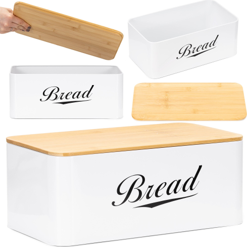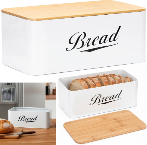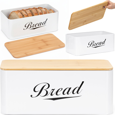 | Šī baltā metāla maizes kaste ar bambusa vāku apvieno eleganci ar ikdienas ērtībām. Dabīgā bambusa vāks kalpo arī kā griešanas dēlis, ļaujot pagatavot maizes šķēles, neizmantojot papildu piederumus. Maizes kastes baltā krāsa piešķir tai maigu, svaigu raksturu, kas atdzīvina virtuves telpu. Iekšpusē ir vieta dažādu veidu maizei: maize vai maizītes tajā ērti iederas.