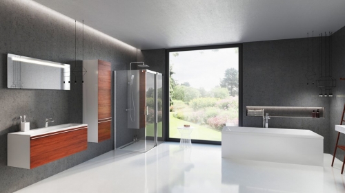 Elitāro mēbeļu dizainu uzsver finiera virsma. Precīzās malas ar 45° slīpumu piedāvā tirgū ekskluzīvi smalku vannas istabu risinājumu.