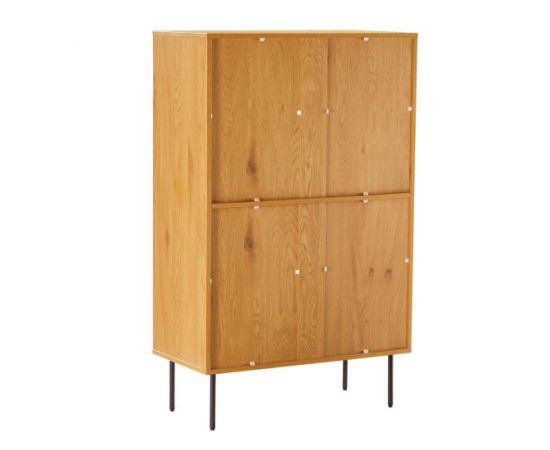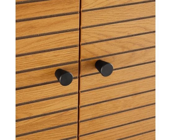 Skapis LINE 80x40xH130cm. Skapis izgatavots no melamīna plātnes ar ozola rakstu. Svītrainie durvju paneļi ar reljefu virsmu ir izgatavoti no melnas MDF plātnes un dekorēti ar šaurām ozola krāsas līstēm. Skapja metāla kājas ir pārklātas ar melnu pulverkrāsojumu.