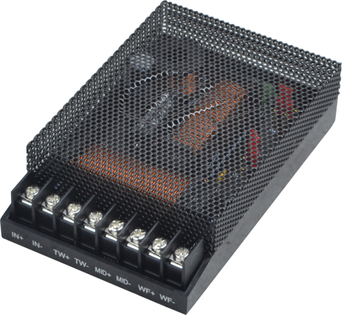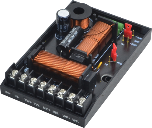 12 dB/oct. crossover (mid/high) / 6 dB/oct. crossover (kickwoofer) / Haxagon protection grill.
