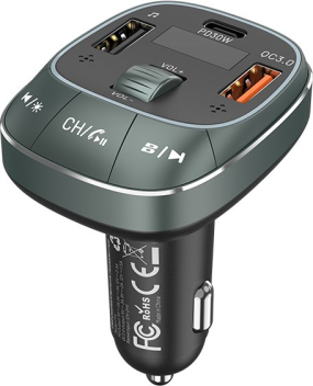 Vention 3-Port USB (C + A + A) Car Charger with FM Transmitter (30W/18W/5W) Black ABS Type