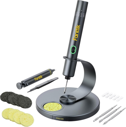 Fanttik T1 Max soldering kitFanttik T1 Max is a compact soldering iron equipped with four soldering tips (C210-I, C210-IS and two C210-K) with long life and oxidation resistance. The shortest tip heating time is only 7 seconds, which reduces waiting time and increases productivity. A tin extractor and precision tweezers are also included to facilitate safe and accurate soldering.