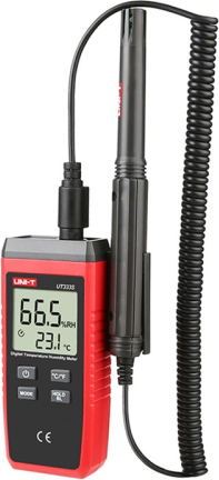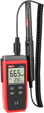 UNI-T UT333S temperature and humidity meterThe UNI-T UT333S features a split-type sensor with a flexible spring-loaded cable, making it ideal for measurements in hard-to-reach places - such as air ducts, equipment interiors or corners of industrial installations. The UT333S is a useful tool both at home and in technical environments, where fast and precise readings of ambient conditions are important.