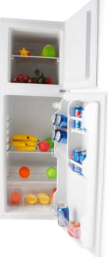 Practical two-door refrigerator is ideal for a medium-sized family to store everyday food.