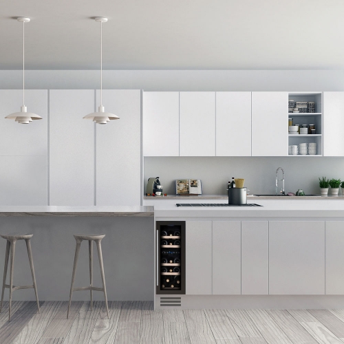 | A dual temperature zone, 17 bottle undercounter model, boasting an elegant exterior and a stainless steel door handle. The DUNAVOX Flow-17 is perfect for contemporary kitchen environments. Bottles are supported on solid wooden shelves set into a stunning light blue interior. The humidity control system keeps the moisture needed to store wine in the refrigerator for longer. With the supplied plastic container, water can be added if necessary to maintain the correct moisture level in the refrigerator. Vibration free storing. Integrated ventilation system. Fan assisted cooling. Please note that this model is intended as a built in undercounter unit. The lower temperature is in the upper zone, the temperature difference can be up to 6 ° C. It is not allowed to set the lower zone colder than the upper zone! |