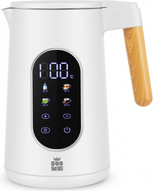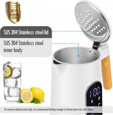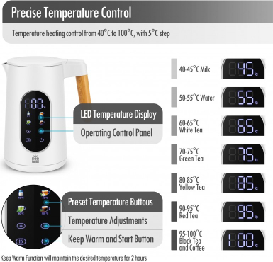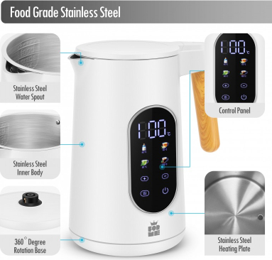| Большой цифровой дисплей температуры Четыре кнопки для четырех предустановленных температур Выбор температуры в диапазоне 40-100°C с шагом 5°C Автоматическая функция поддержания тепла после закипания Автоматический режим ожидания для экономии энергии Отображение фактической температуры воды Скрытый нагревательный элемент из нержавеющей стали SUS304 Внутренние стенки из нержавеющей стали SUS304 с внешним пластиковым покрытием Объем: 1,7 л, Питание: 220-240 В 50/60 Гц 2200 Вт |