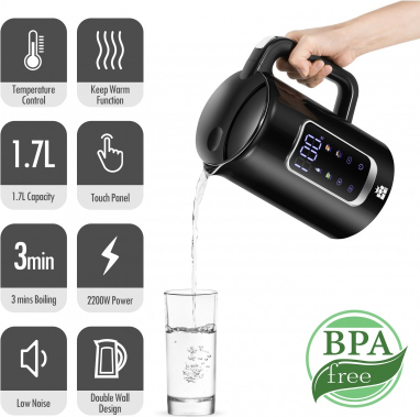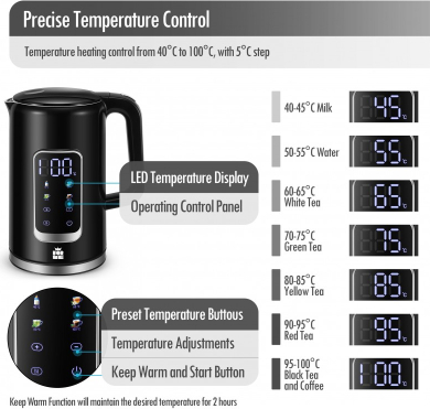 | Большой цифровой дисплей температуры Четыре кнопки для четырех предустановленных температур Выбор температуры в диапазоне 40-100°C с шагом 5°C Автоматическая функция поддержания тепла после закипания Автоматический режим ожидания для экономии энергии Отображение фактической температуры воды Скрытый нагревательный элемент из нержавеющей стали SUS304 Внутренние стенки из нержавеющей стали SUS304 с внешним пластиковым покрытием Объем: 1,7 л, Питание: 220-240 В 50/60 Гц 2200 Вт |