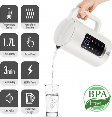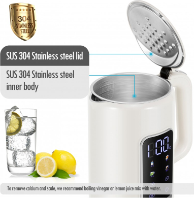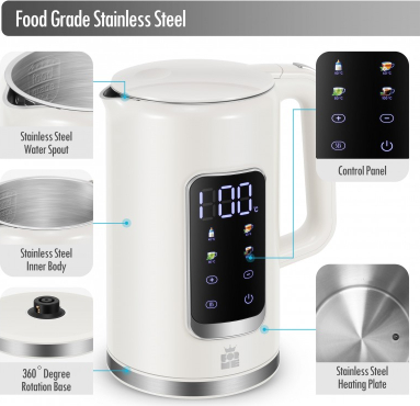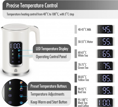 | Большой цифровой дисплей температуры Четыре кнопки для четырех предустановленных температур Выбор температуры в диапазоне 40-100°C с шагом 5°C Автоматическая функция поддержания тепла после закипания Автоматический режим ожидания для экономии энергии Отображение фактической температуры воды Скрытый нагревательный элемент из нержавеющей стали SUS304 Внутренние стенки из нержавеющей стали SUS304 с внешним пластиковым покрытием Объем: 1,7 л, Питание: 220-240 В 50/60 Гц 2200 Вт |