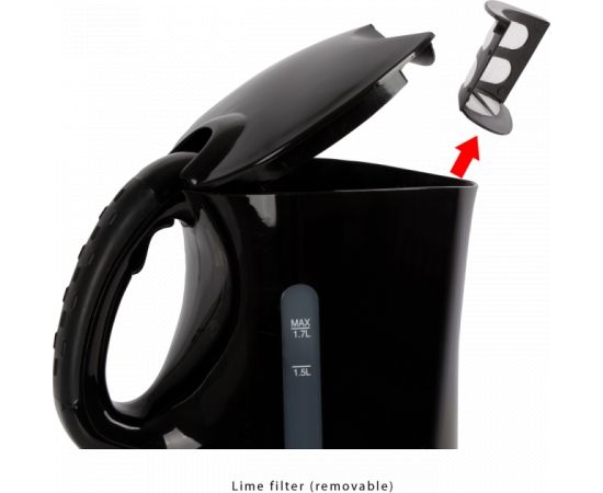 Max. capacity 1,7 litre Simple handling due to cable-free technology – easy to pour in and out Safety hinged lid with one-hand operation Lime filter (removable) On/off switch (illuminated) Stainless steel heating element Automatic/manual switch-off 2 external water level indicators Rubber profile on the handle Base station with cord storage Evaporation/overheating protection 220–240 V, 50 Hz |