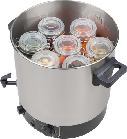 For preserving and sterilizing fruit and vegetable containers. Internal volume 27 liters, up to 14 glass jars (with a volume of 1L) 31.1 cm diameter rack for glass jars Preserve compotes, marmalades and purées as well as salads, meats, sauces, broths and much more. The biggest advantage of home canning is being aware of what you are canning! It is also suitable for making soups, goulash, hot drinks and cider, and even for brewing home beer. It is an excellent helper at gatherings, banquets, when preparing food for a larger group. Easy-to-clean stainless steel that does not affect taste or smell. The built-in outlet is suitable for bottling mulled wine, tea, punch or other hot drinks. Two operating modes Adjustable timer 20 minutes - 2 hours Continuous operation - keep warm function The temperature range of the thermostat is 30°C to 100°C Automatic temperature control Sound notification when the set temperature is reached Plastic cover with practical handle Handles with thermal insulation. Covered heater - with a flat bottom Dual security system: Safety protection against overheating Protection against empty operation Dimensions with lid (H x D): 45.5 x 38 cm |