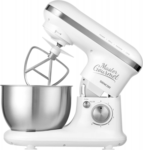 4 сменных насадки: крюк для замеса (для тяжелого и прочного дрожжевого теста), А-образная насадка для смешивания (для кремов и легкого теста без дрожжей), насадка для взбивания (для взбивания сливок, яичных белков и т. Д.), Разливочный экран.