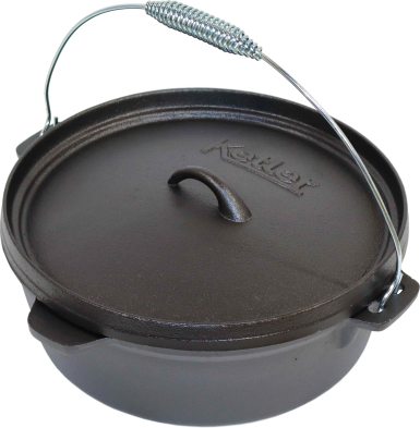 | Čuguna katls ar vāku. Paredzēts ēdienu gatavošanai uz uguns vai grila. Pateicoties biezajām sienām spēj uzturēt lielu karstumu ilgu laika un to vienmērīgi izplatīt. Vāks ar paaugstinātām malām ogļu novietošanai, nodrošina, ka šo katlu var izmantot visu veidu gatavošanai, sākot no cepeša līdz kūkām, cepumiem un maizei. Čuguna trauki ir ilgmūžīgi, izturīgi pret sadegšanu, mehāniskiem bojājumiem, nepakļaujas deformācijai un ir nekaitīgi cilvēkam. Katla tilpums 6 l. |
