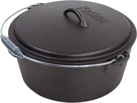 | Čuguna katls ar vāku. Paredzēts ēdienu gatavošanai uz uguns vai grila. Pateicoties biezajām sienām spēj uzturēt lielu karstumu ilgu laika un to vienmērīgi izplatīt. Čuguna trauki ir ilgmūžīgi, izturīgi pret sadegšanu, mehāniskiem bojājumiem, nepakļaujas deformācijai un ir nekaitīgi cilvēkam. Katla tilpums 8.5 l. |