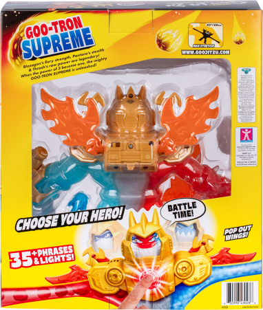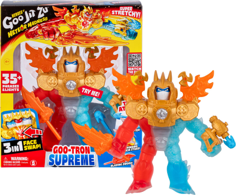 | Goo-Tron Supreme ir izcilākais Heroes of Goo Jit Zu varonis, kas apvieno Blazagon, Pantaro un Thrash spējas. Ar vairāk nekā 35 frāzēm, gaismas efektiem un maināmiem ieročiem bērni var izvēlēties cīņas vadītāju. Stiep, grozi un spied Goo-Tron līdz trīs reizēm lielākam, lai atklātu trīs unikālus goo pildījumus. Gatavs episkām Meteor Madness cīņām. | ||||||||||||||||||||