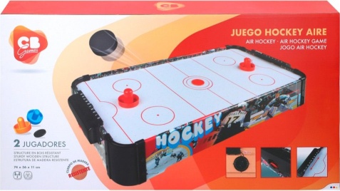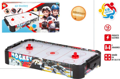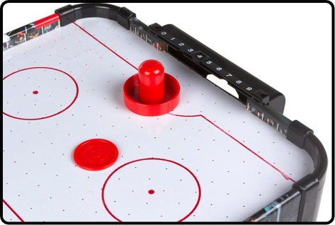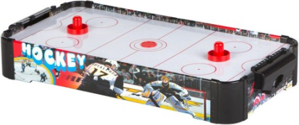• Поле имеет прочный корпус, ворота с каждой стороны, 2 метателя и 2 шайбы. Воздух подается через отверстия в основании, позволяя шайбам двигаться так, как будто они находятся на катке.