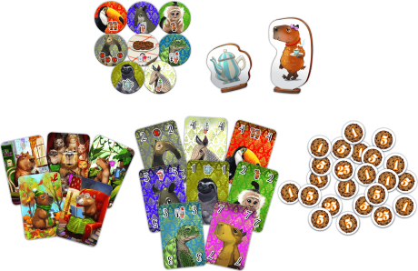 | Вы играете за капибар, которые устроили чаепитие для друзей. Среди дорогих гостей — представители фауны Южной Америки, известнейшие из которых — те самые капибары. Игроки могут рассчитывать не только на превосходный чай, но и на вкусное печенье под приятную беседу. Однако, несмотря на врожденное гостеприимство, у капибар есть тайный план: они хотят, чтобы как можно больше печенья осталось в их лапах. Чтобы победить в этой очаровательной игре, полной стратегических хитросплетений, нужно действовать с умом и планировать ходы заранее. Ваша цель: разыграть карты таким образом, чтобы к концу игры печенья у вашей капибары осталось больше всех. | ||||||||||||||||||||
