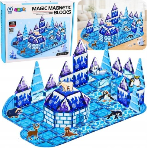 Leantoys Klocki Magnetyczne Lodowa Kraina Figurki Zwierząt Niebieskie 94 el.