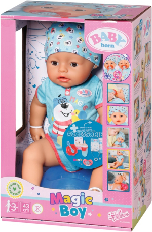 "Ak, puisīt, vai negribi iet gulēt?" Zēns guļ gultā ar plaši atvērtām acīm un knupīti mutē. Ir pienācis laiks trikam, kas ikvienu vecāku vai aukli padarīs zaļu no skaudības: vienkārši pagrieziet knupīti, un mazais zēns aizver acis. Ja tas būtu tik vienkārši ar īstiem mazuļiem... Pagriežot knupīti, tiek atvērtas un aizvērtas lelles acis, neatkarīgi no viņa ķermeņa stāvokļa. Mazajam zēnam ir arī miegainas acis. Ja viņu noliek uz muguras bez knupīša, acis automātiski aizveras. Viņa iecienītākās nodarbes ir gulēt, ēst un mazgāties. Viņam patīk dzert ūdeni no pudeles. Tad viņš var slapināt autiņā vai podiņā un raudāt īstas asaras. “BABY born” var ne tikai dzert ūdeni, bet arī ēst putru. Pēc tam viņš arī nokārtojas. Viņa rokas, kājas un galva ir ārkārtīgi kustīgas, tāpēc apģērba uzvilkšana un novilkšana ir bērna spēle. Skārienjutīgais ķermenis ir patīkams un mīksts. Pamatkomplektā ietilpst 10 aksesuāri, kas atbalsta viņa funkcijas, zils bodijs un cepure. Funkcijas: “BABY born Magic” ar 10 reālistiskām funkcijām, kas nodrošina daudz jautrības. Dažādas (lomu) spēles ar “BABY born” veicina iztēli, un ir pierādīts, ka tās palīdz attīstīt sociālās prasmes un vērtības, piemēram, atbildību, komunikāciju un empātiju. Knupītis ir piemērots visām “BABY born” 43 cm lellēm. Acu funkcija ar knupīti darbojas tikai ar “BABY born Magic”. | ||||||||||||||||||||