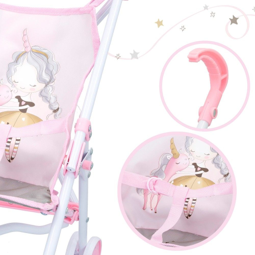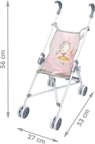 С коляской Baby Fairies малыши могут брать своих кукол с собой повсюду, как мама и папа! Коляска лёгкая и складная, занимает совсем немного места. Высота ручки — 55,5 см, а сиденье рассчитано на кукол ростом от 30 до 40 см (кукла в комплект не входит). Она также оснащена трёхточечным ремнём безопасности с пряжкой, чтобы малыш не укатился во время прогулки.