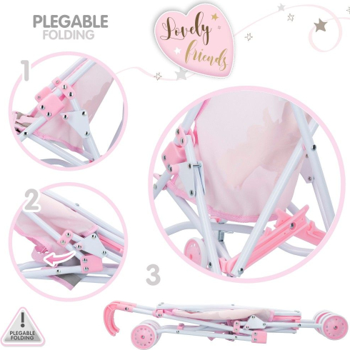 Рекомендуемый возраст для этой складной коляски — от 3 лет. Она способствует ролевым играм, развитию воображения и крупной моторики. Складной игровой стульчик в форме зонтика доступен в двух цветах: розовом или сером (цвет выбирается случайным образом).